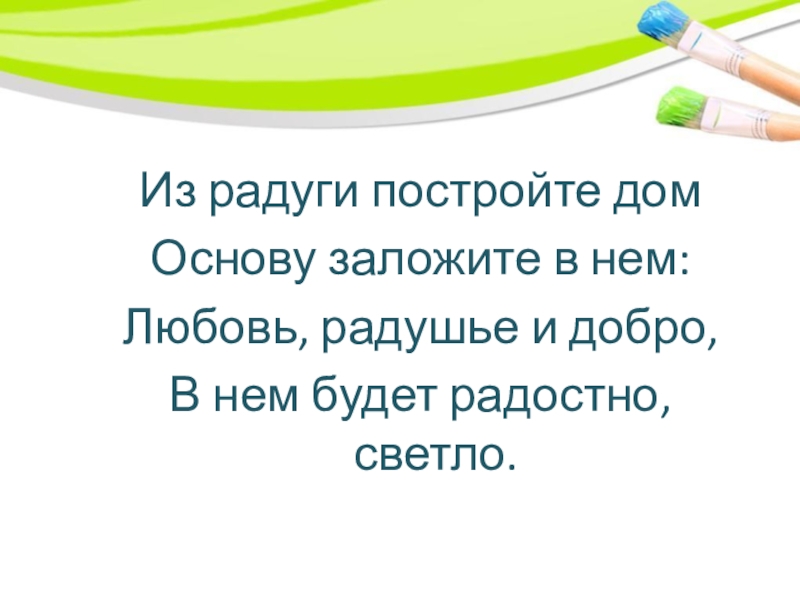Из радуги постройте домОснову заложите в нем:Любовь, радушье и добро,В нем будет радостно, светло.