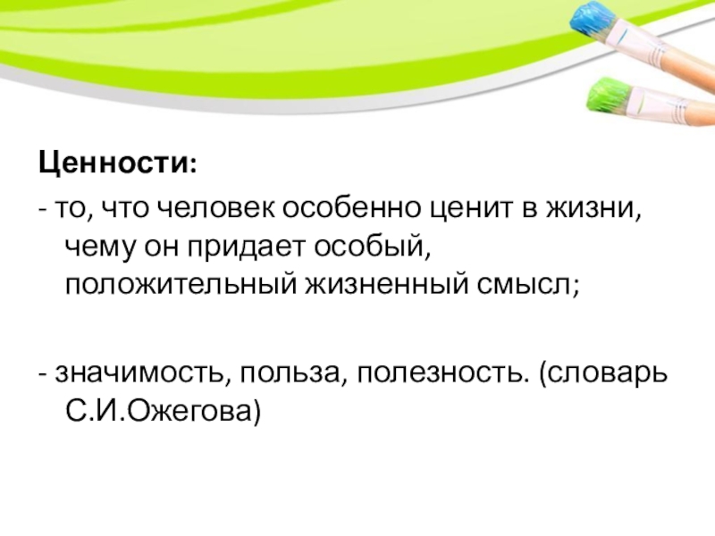 Ценности:- то, что человек особенно ценит в жизни, чему он придает особый, положительный жизненный смысл; - значимость,