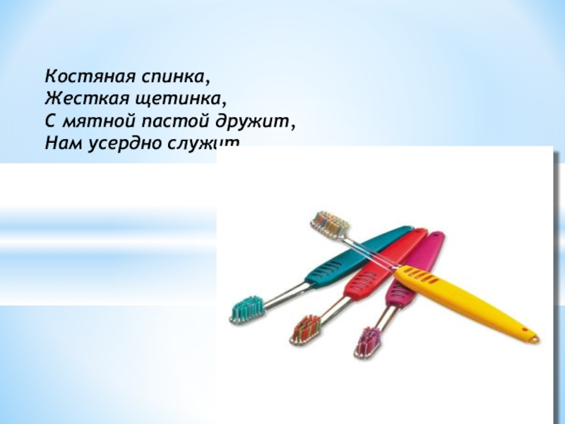 Слайд 9Костяная спинка, Жесткая щетинка, С мятной пастой дружит, Нам усердно служит.