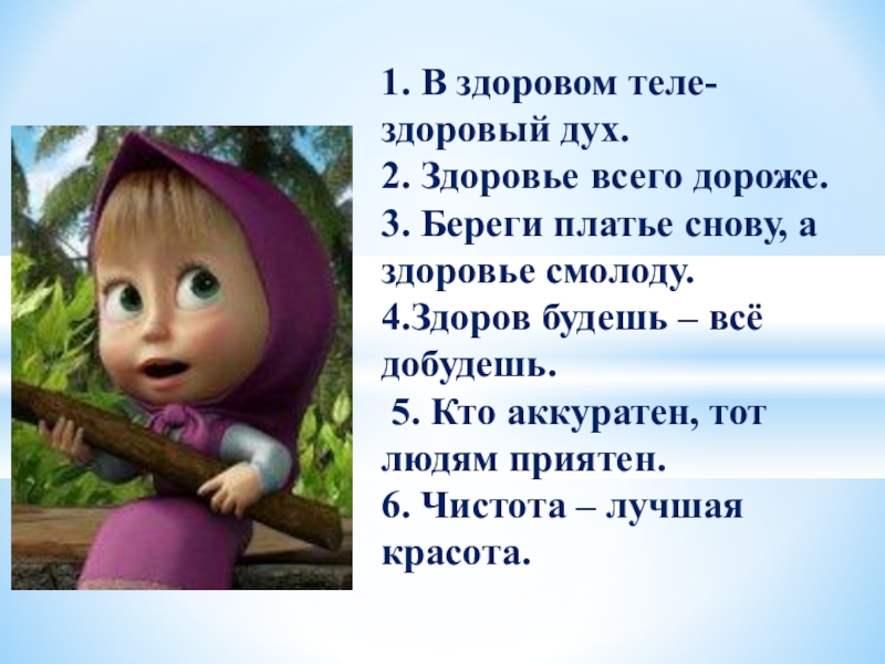 1. В здоровом теле-здоровый дух.2. Здоровье всего дороже.3. Береги платье снову, а здоровье смолоду.4.Здоров будешь – всё добудешь. 5. Кто аккуратен, тот людям приятен.6. Чистота – лучшая красота.