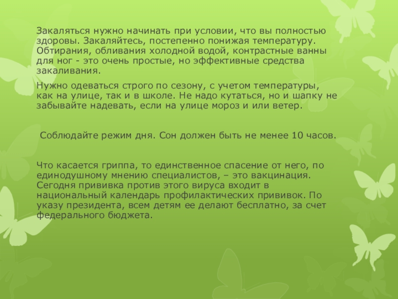 Слайд 10Закаляться нужно начинать при условии, что вы полностью здоровы. Закаляйтесь, постепенно