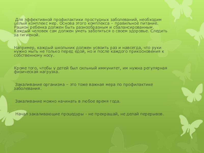 Слайд 9 Для эффективной профилактики простудных заболеваний, необходим целый комплекс мер. Основа