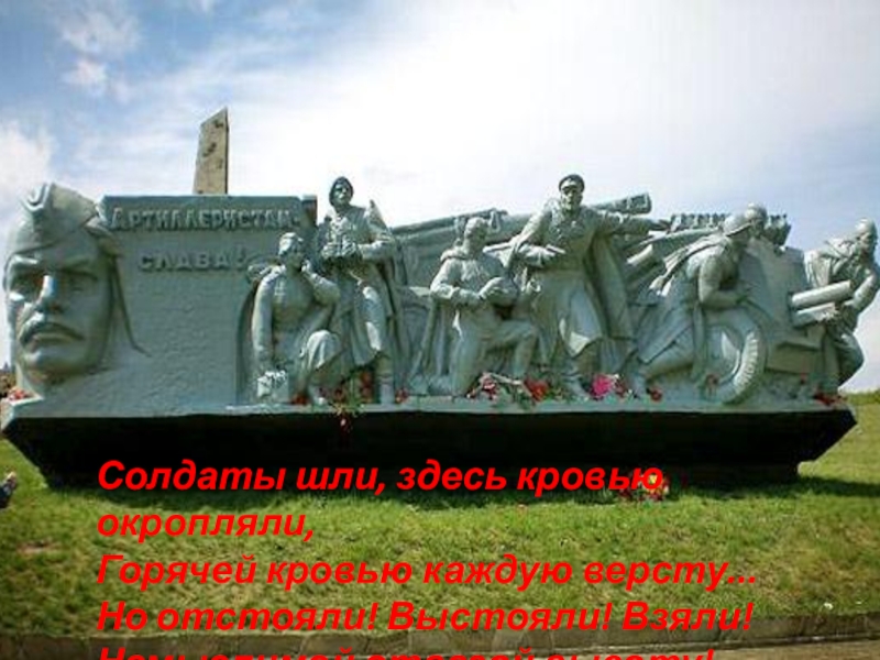Солдаты шли, здесь кровью окропляли,Горячей кровью каждую версту...Но отстояли! Выстояли! Взяли!Немыслимой отвагой высоту!