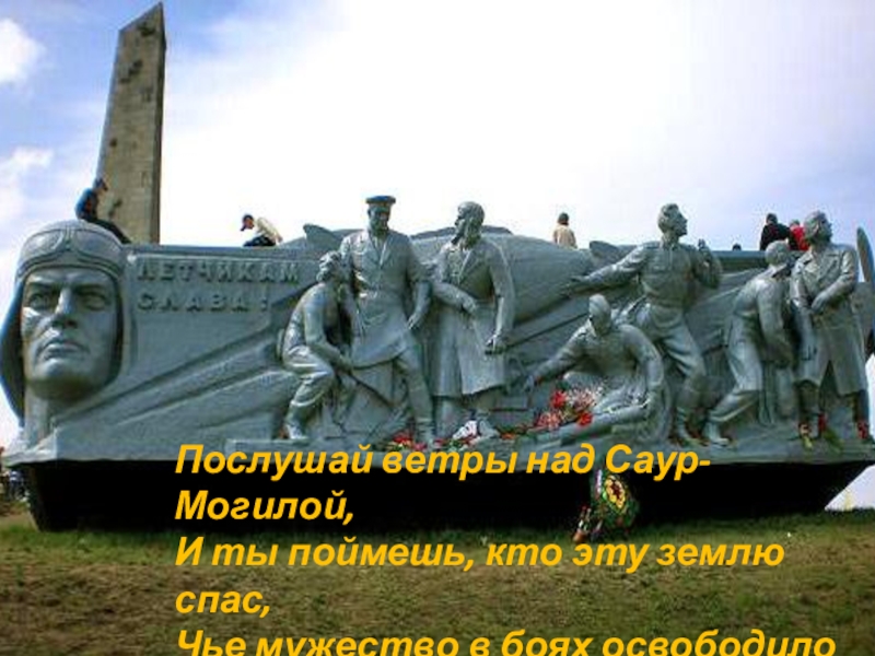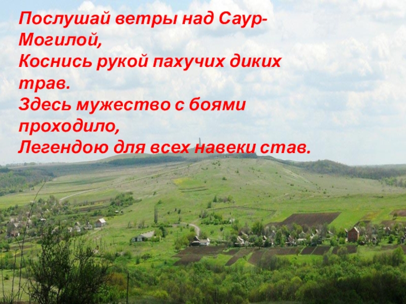 Послушай ветры над Саур-Могилой,Коснись рукой пахучих диких трав.Здесь мужество с боями проходило,Легендою для всех навеки став...