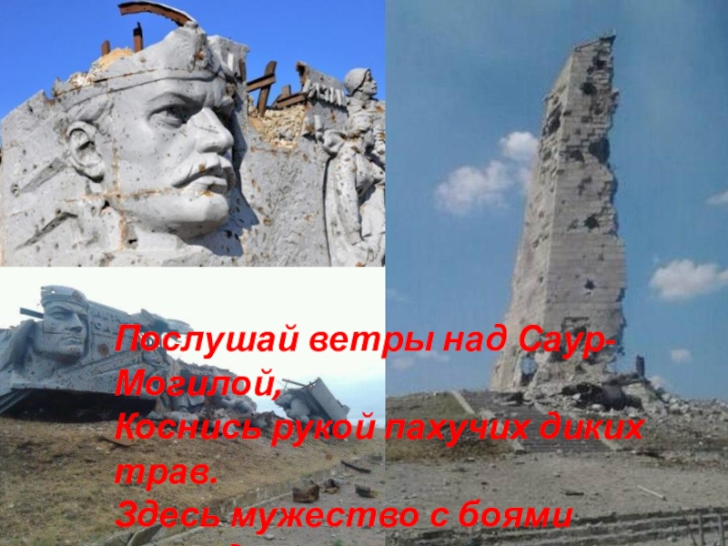 Послушай ветры над Саур-Могилой,Коснись рукой пахучих диких трав.Здесь мужество с боями проходило,Легендою для всех навеки став.