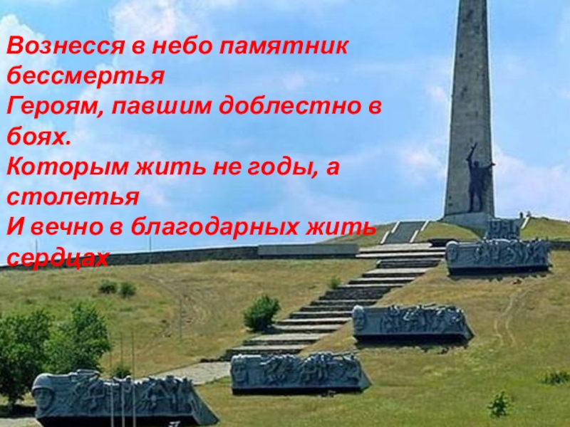 Вознесся в небо памятник бессмертьяГероям, павшим доблестно в боях.Которым жить не годы, а столетьяИ вечно в благодарных