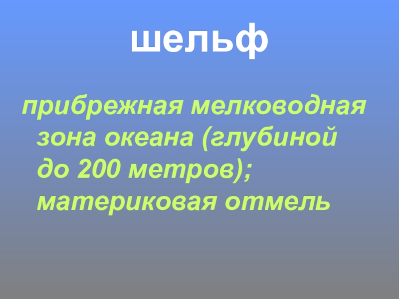 шельфприбрежная мелководная зона океана (глубиной до 200 метров); материковая отмель