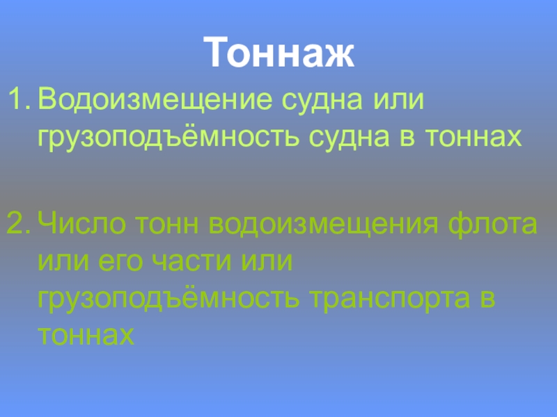 ТоннажВодоизмещение судна или грузоподъёмность судна в тоннахЧисло тонн водоизмещения флота или его части или грузоподъёмность транспорта в