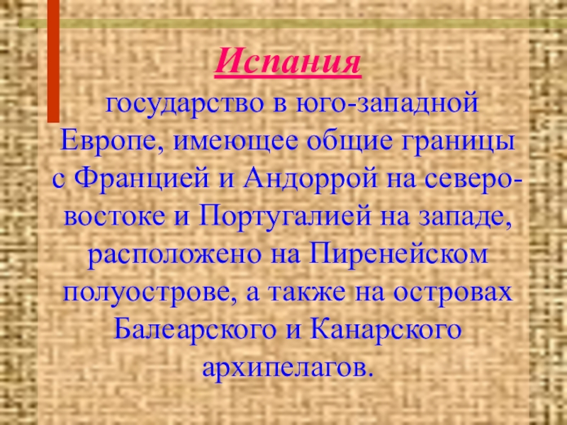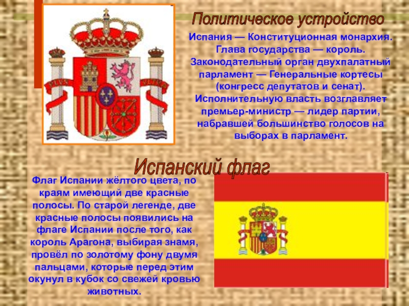 Флаг Испании жёлтого цвета, по краям имеющий две красные полосы. По старой легенде, две красные полосы появились на флаге Испании после того, как король Арагона, выбирая знамя, провёл по золотому фону двумя пальцами, которые перед этим окунул в кубок со свежей кровью животных.