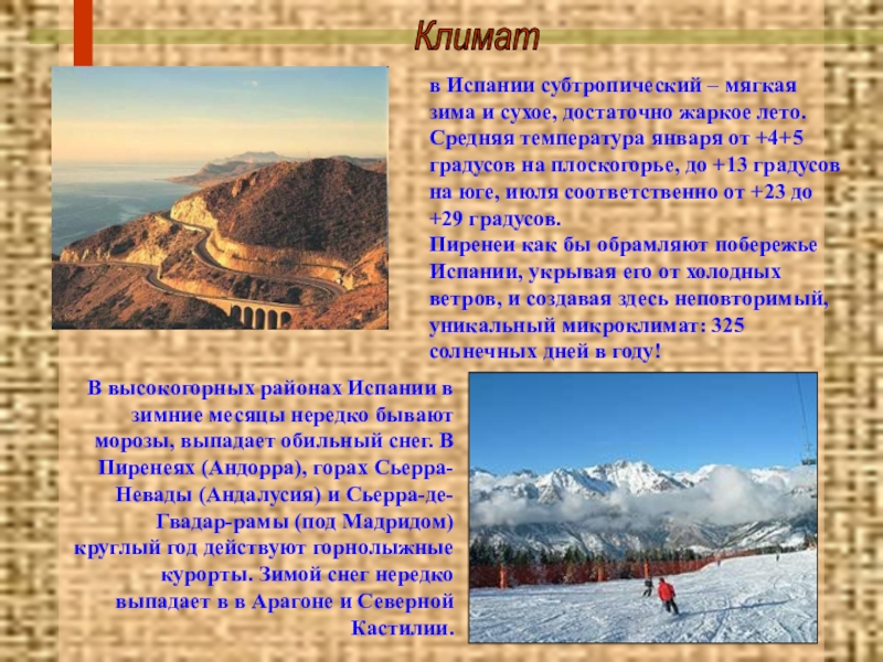В высокогорных районах Испании в зимние месяцы нередко бывают морозы, выпадает обильный снег. В Пиренеях (Андорра), горах Сьерра-Невады (Андалусия) и Сьерра-де-Гвадар-рамы (под Мадридом) круглый год действуют горнолыжные курорты. Зимой снег нередко выпадает в в Арагоне и Северной Кастилии.