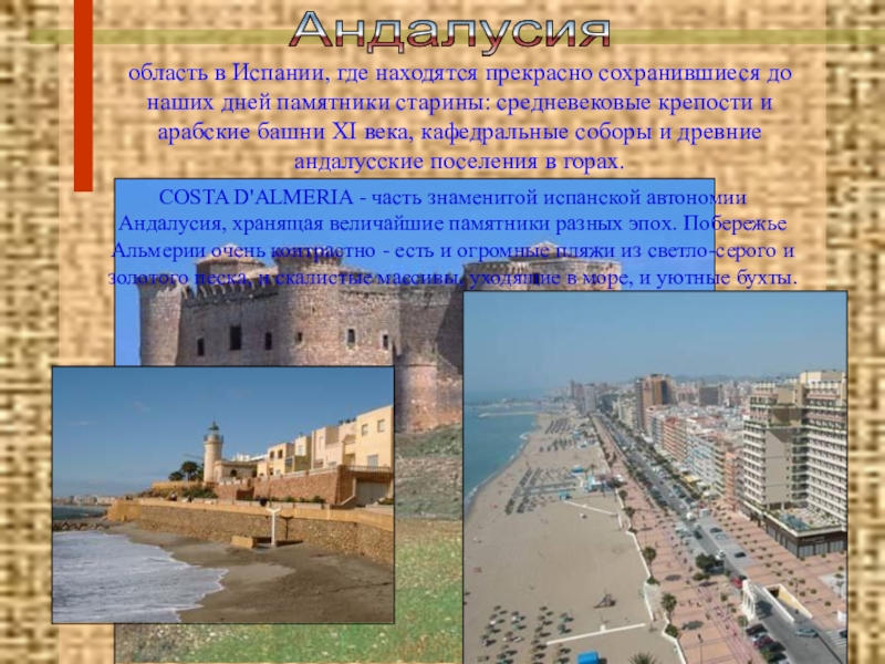 COSTA D'ALMERIA - часть знаменитой испанской автономии Андалусия, хранящая величайшие памятники разных эпох. Побережье Альмерии очень контрастно - есть и огромные пляжи из светло-серого и золотого песка, и скалистые массивы, уходящие в море, и уютные бухты.