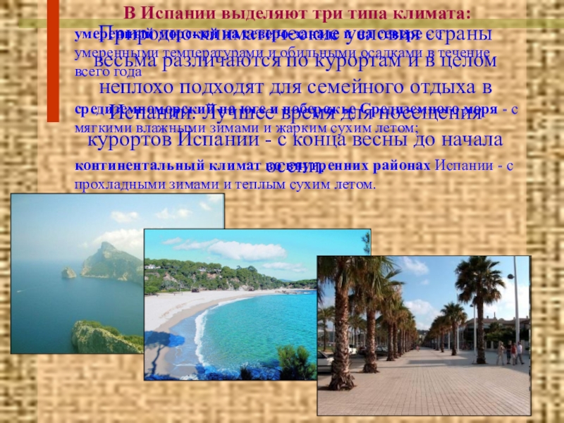 Природно-климатические условия страны весьма различаются по курортам и в целом неплохо подходят для семейного отдыха в Испании. Лучшее время для посещения курортов Испании - с конца весны до начала осени.