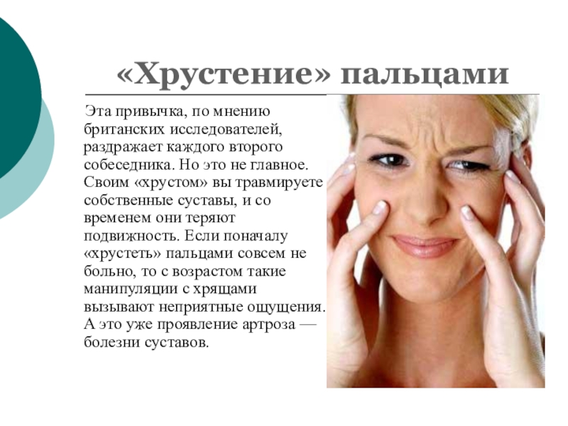 второго собеседника. Но это не главное. Своим «хрустом» вы травмируете собственные суставы, и со временем они теряют подвижность. Если поначалу «хрустеть» пальцами совсем не больно, то с возрастом такие манипуляции с хрящами вызывают неприятные ощущения. А это уже проявление артроза — болезни суставов.