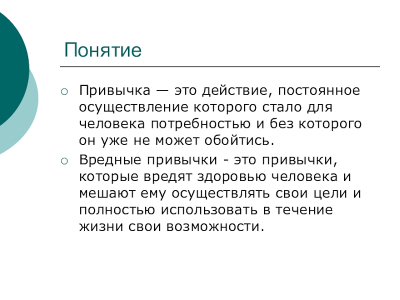 Вредные привычки - это привычки, которые вредят здоровью человека и мешают ему осуществлять свои цели и полностью использовать в течение жизни свои возможности.