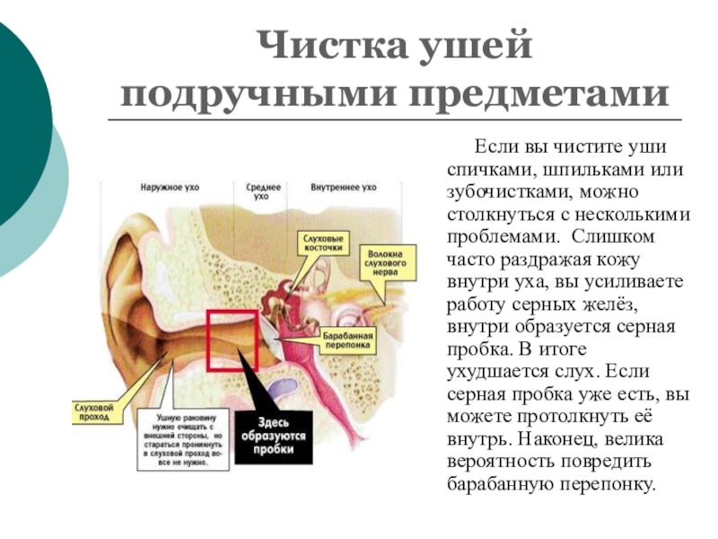 чистите уши спичками, шпильками или зубочистками, можно столкнуться с несколькими проблемами. Слишком часто раздражая кожу внутри уха, вы усиливаете работу серных желёз, внутри образуется серная пробка. В итоге ухудшается слух. Если серная пробка уже есть, вы можете протолкнуть её внутрь. Наконец, велика вероятность повредить барабанную перепонку.