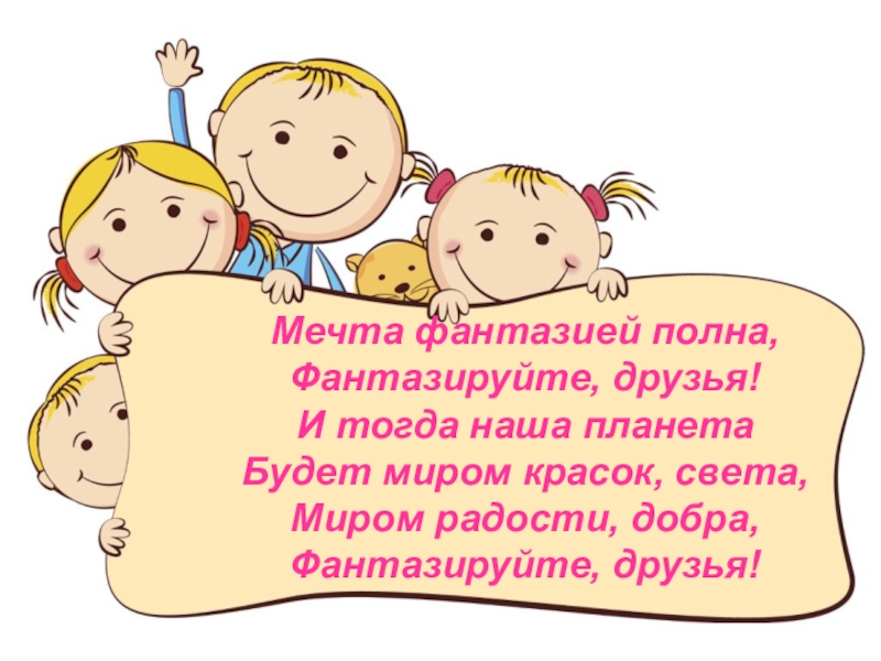 Мечта фантазией полна, Фантазируйте, друзья! И тогда наша планета Будет миром красок, света,  Миром радости, добра,