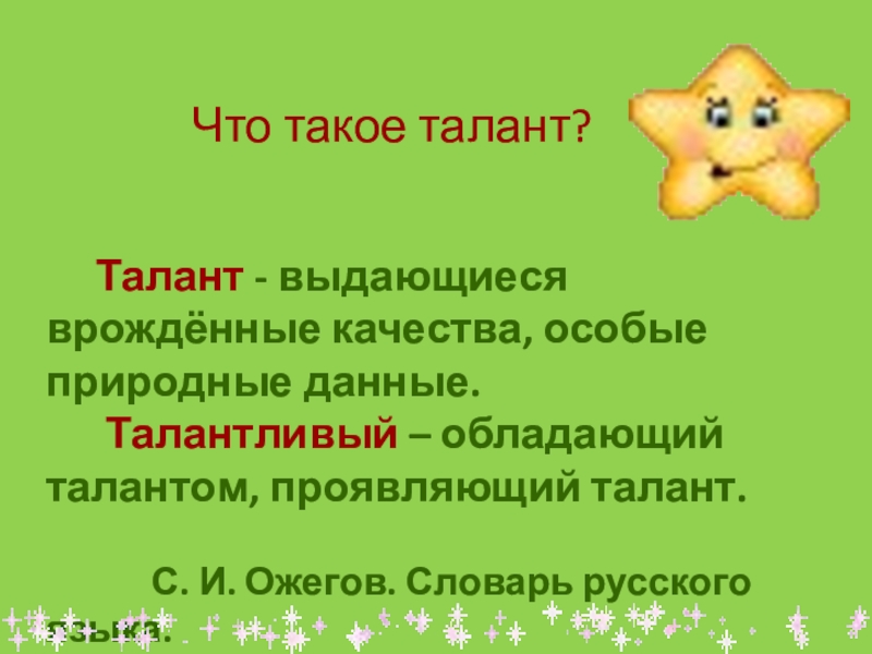 Что такое талант? Талант - выдающиеся врождённые качества, особые природные данные. Талантливый – обладающий талантом, проявляющий талант.
