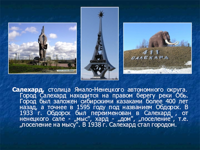 реки Обь. Город был заложен сибирскими казаками более 400 лет назад, а точнее в 1595 году под названием Обдорск. В 1933 г. Обдорск был переименован в Салехард , от ненецкого сале - „мыс", хард - „дом", „поселение", т.е. „поселение на мысу". В 1938 г. Салехард стал городом.