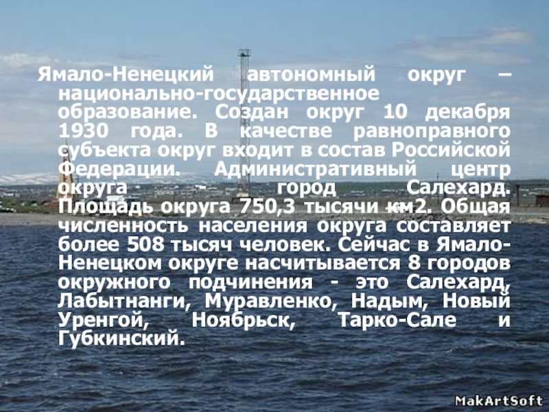 Слайд 2Ямало-Ненецкий автономный округ – национально-государственное образование. Создан округ 10 декабря 1930