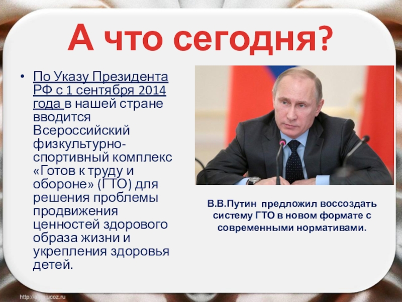 В.В.Путин предложил воссоздать систему ГТО в новом формате с современными нормативами.