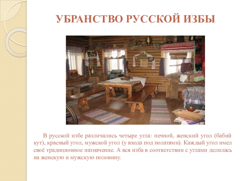 (бабий кут), красный угол, мужской угол (у входа под полатями). Каждый угол имел своё традиционное назначение. А вся изба в соответствии с углами делилась на женскую и мужскую половину.