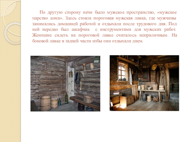 Слайд 19По другую сторону печи было мужское пространство, «мужское царство дома». Здесь