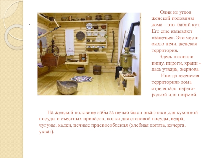 На женской половине избы за печью были шкафчики для кухонной посуды и съестных припасов, полки для столовой посуды, ведра, чугуны, кадки, печные приспособления (хлебная лопата, кочерга, ухват).