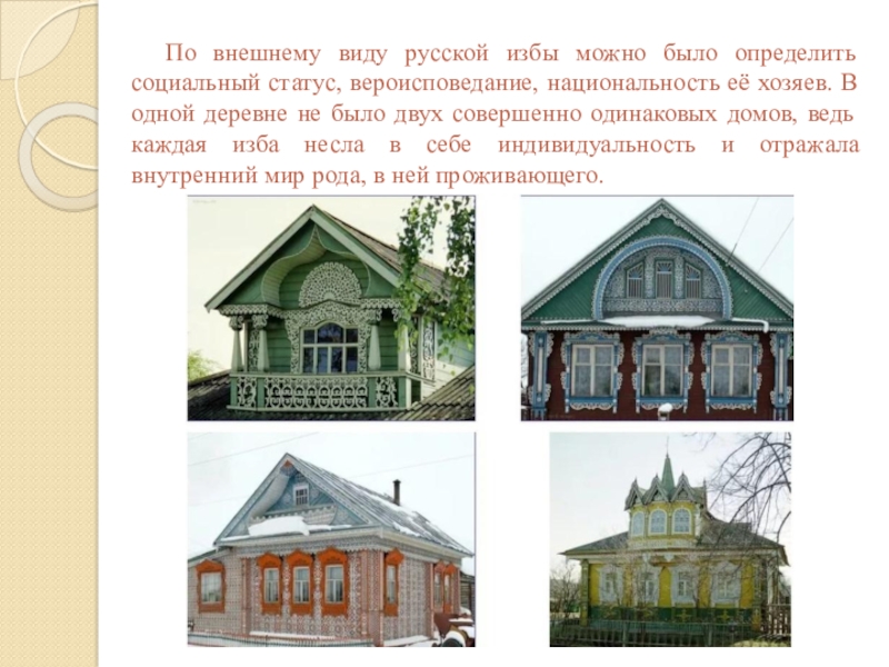 Слайд 8По внешнему виду русской избы можно было определить социальный статус, вероисповедание,