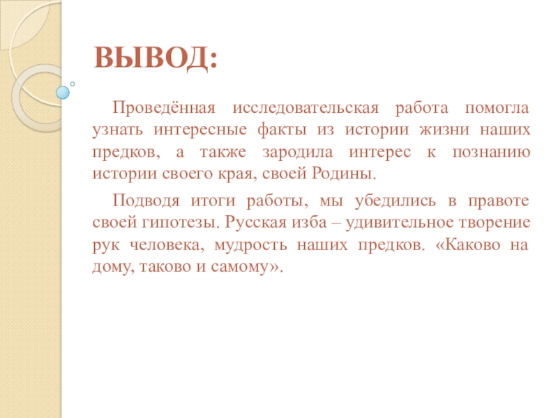 Подводя итоги работы, мы убедились в правоте своей гипотезы. Русская изба – удивительное творение рук человека, мудрость наших предков. «Каково на дому, таково и самому».