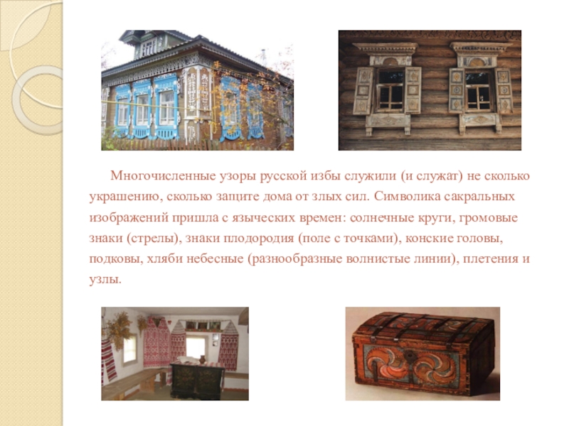 Слайд 22Многочисленные узоры русской избы служили (и служат) не сколько украшению, сколько