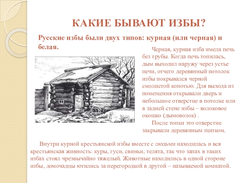 Черная, курная изба имела печь без трубы. Когда печь топилась, дым выходил наружу через устье печи, отчего деревянный потолок избы покрывался черной смолистой копотью. Для выхода из помещения открывали дверь и небольшое отверстие в потолке или в задней стене избы – волоковое окошко (дымоволок) .