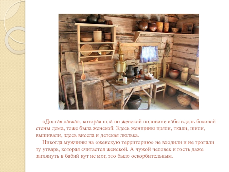 Слайд 16«Долгая лавка», которая шла по женской половине избы вдоль боковой стены