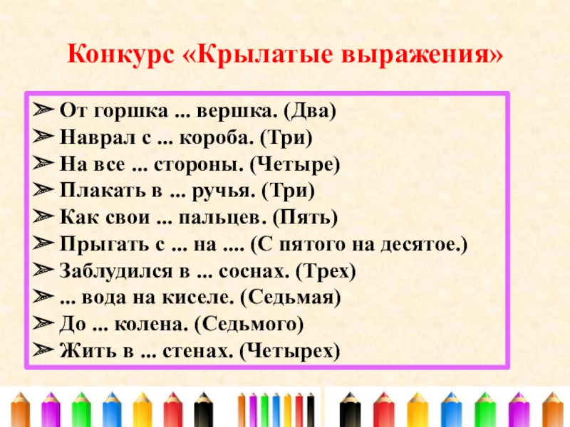 Конкурс «Крылатые выражения»➢ От горшка ... вершка. (Два)➢ Наврал с ... короба. (Три)➢ На все ... стороны.