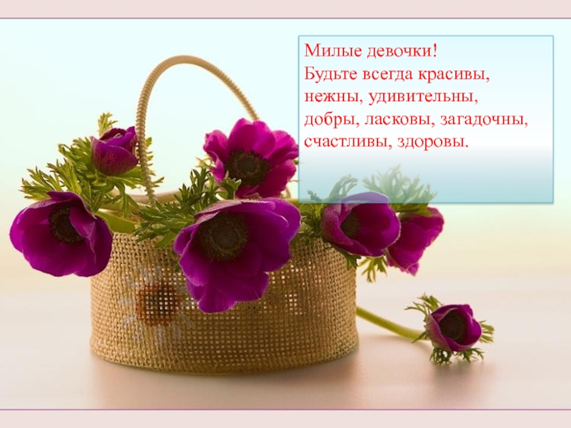 Милые девочки!  Будьте всегда красивы, нежны, удивительны,  добры, ласковы, загадочны, счастливы, здоровы.