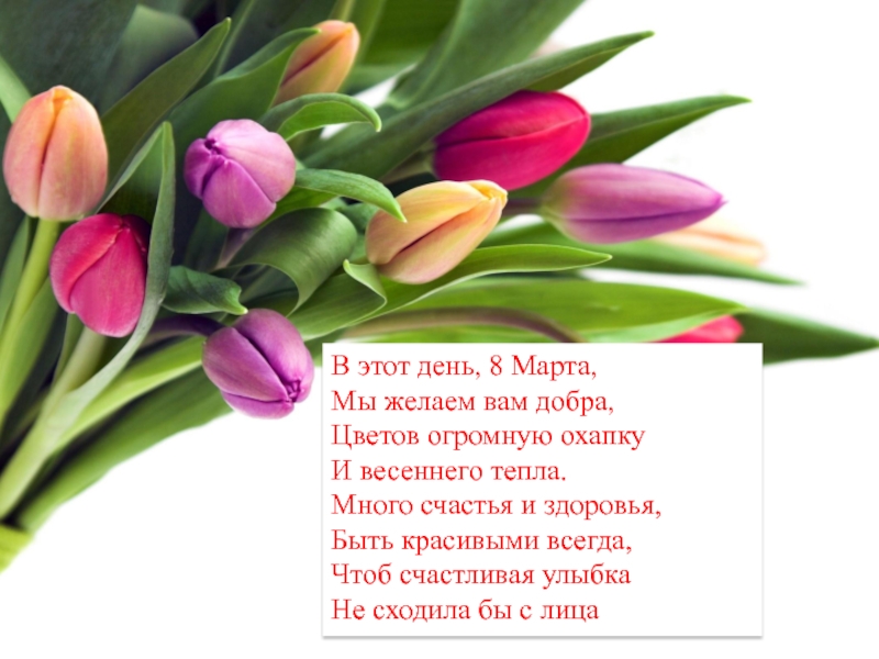 охапку И весеннего тепла. Много счастья и здоровья, Быть красивыми всегда, Чтоб счастливая улыбка Не сходила бы с лица