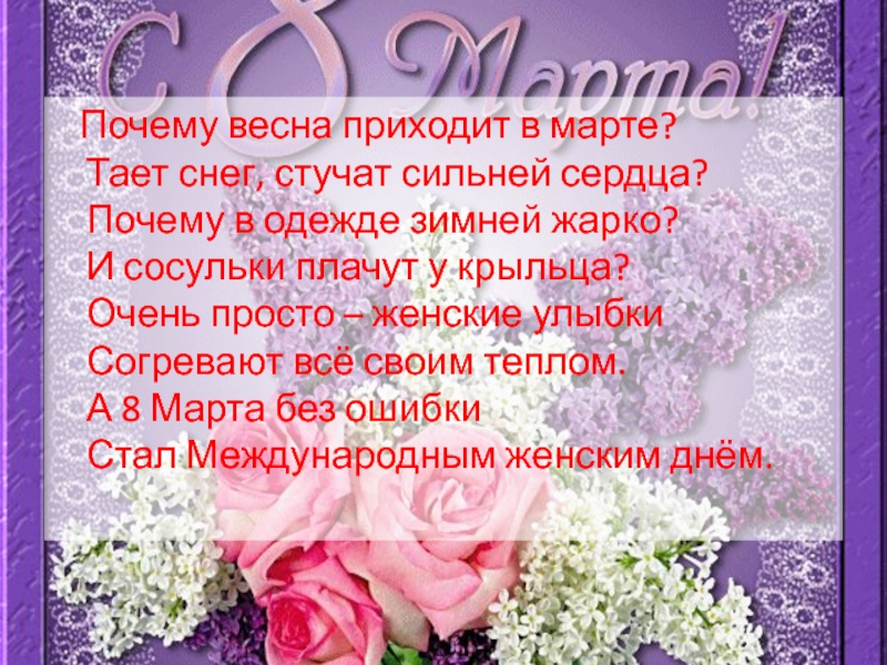 Почему весна приходит в марте? Тает снег, стучат сильней сердца? Почему в одежде зимней жарко? И сосульки плачут у крыльца? Очень просто – женские улыбки Согревают всё своим теплом.