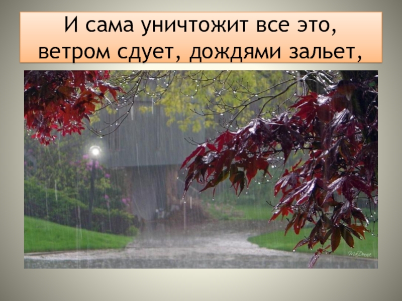 Слайд 7И сама уничтожит все это, ветром сдует, дождями зальет,
