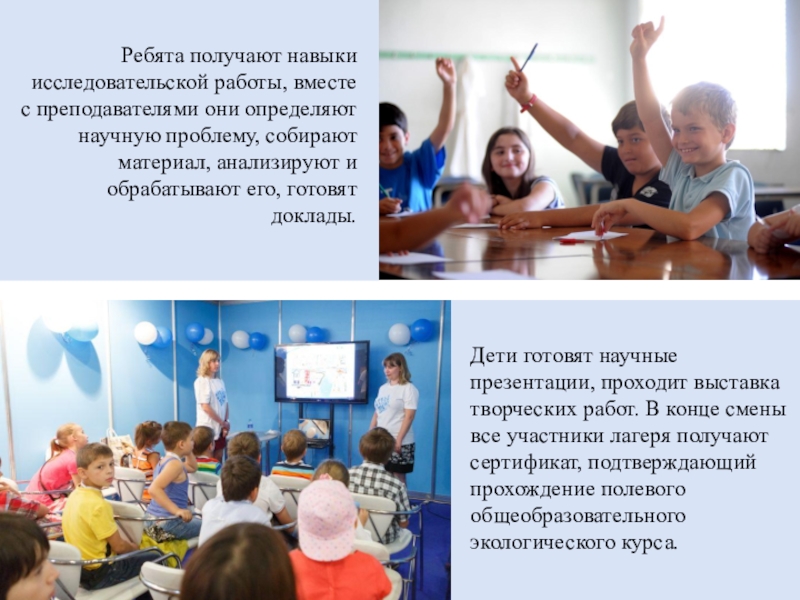 Дети готовят научные презентации, проходит выставка творческих работ. В конце смены все участники лагеря получают сертификат, подтверждающий прохождение полевого общеобразовательного экологического курса.