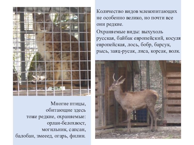 Охраняемые виды: выхухоль русская, байбак европейский, косуля европейская, лось, бобр, барсук, рысь, заяц-русак, лиса, корсак, волк.