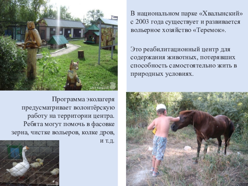В национальном парке «Хвалынский» с 2003 года существует и развивается вольерное хозяйство «Теремок».