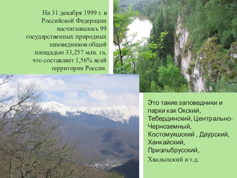 Это такие заповедники и парки как Окский, Тебердинский, Центрально-Черноземный, Костомукшский , Даурский, Ханкайский, Приэльбрусский,
