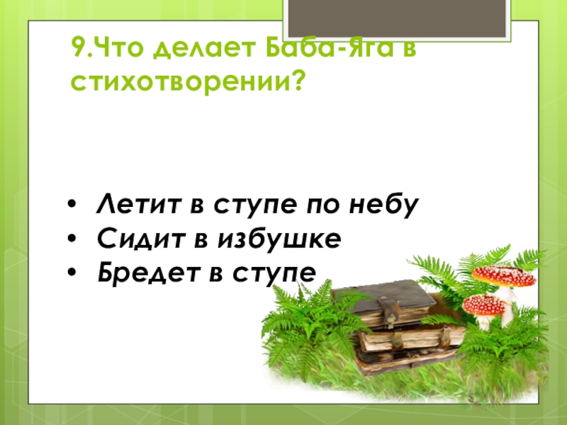 9.Что делает Баба-Яга в стихотворении? Летит в ступе по небуСидит в избушкеБредет в ступе