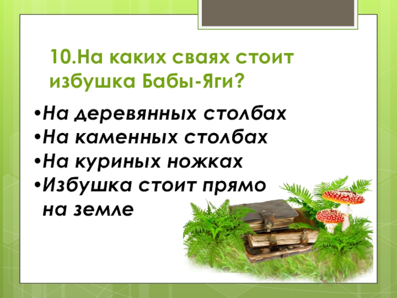 10.На каких сваях стоит избушка Бабы-Яги?На деревянных столбахНа каменных столбахНа куриных ножкахИзбушка стоит прямо на земле
