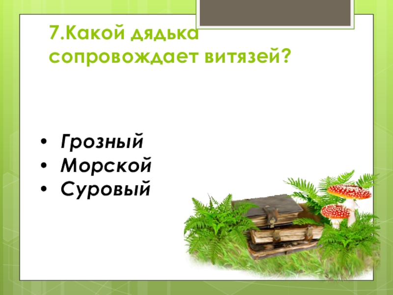 7.Какой дядька сопровождает витязей? ГрозныйМорскойСуровый