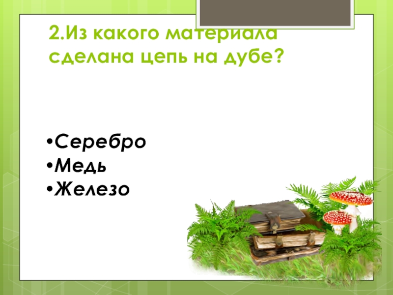 2.Из какого материала сделана цепь на дубе? СереброМедьЖелезо