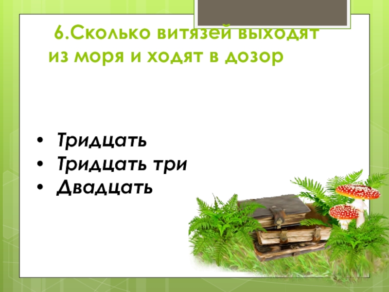 Слайд 19 6.Сколько витязей выходят из моря и ходят в дозор