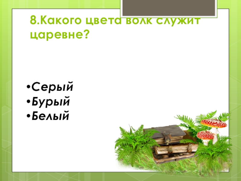 8.Какого цвета волк служит царевне? СерыйБурыйБелый