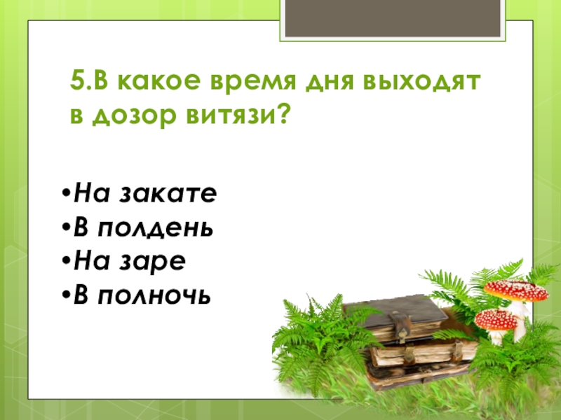 5.В какое время дня выходят в дозор витязи?На закатеВ полденьНа зареВ полночь