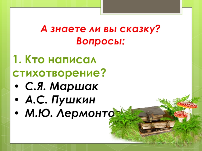 А знаете ли вы сказку? Вопросы:1. Кто написал стихотворение?С.Я. МаршакА.С. ПушкинМ.Ю. Лермонтов