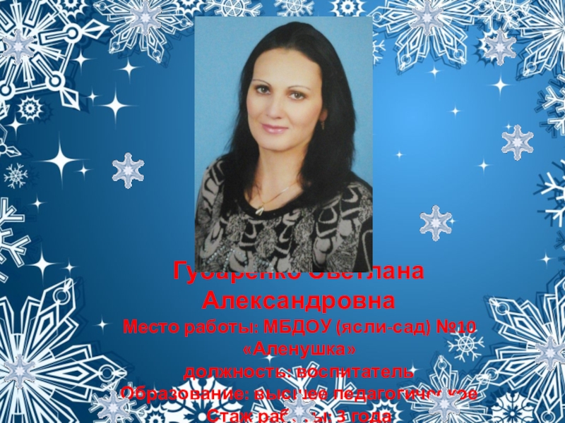 Слайд 27Губаренко Светлана Александровна Место работы: МБДОУ (ясли-сад) №10 «Аленушка» должность: воспитатель Образование: высшее педагогическое